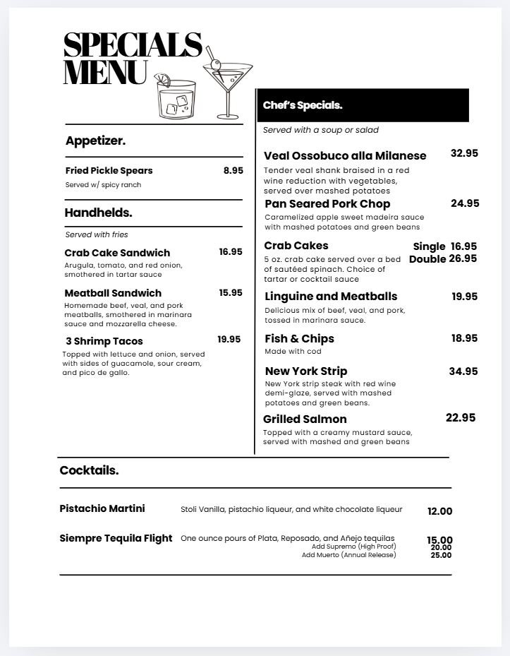 Kitchen:  4:00 pm to 9:00 pm | Bar:  4:00 pm to ?